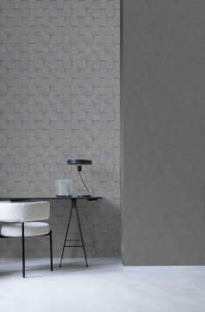 Fein geprägte, blaugraue geometrische Vliestapete mit Vinyloberfläche, 3D-Fliesenimitation, silberne Details.