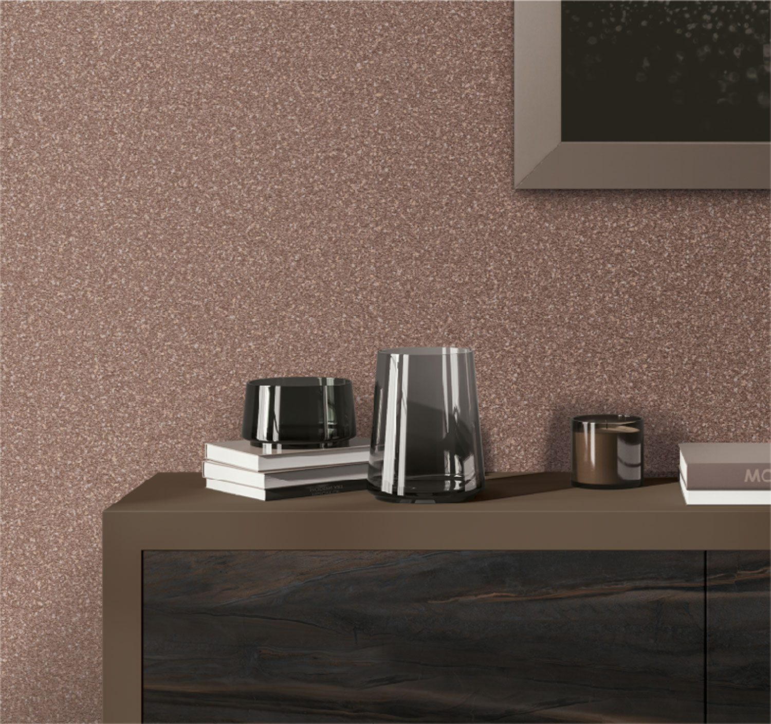 Luxuriöse Vliestapete mit einer Struktur aus kleinen Steinen mit einem dezenten Glanz in ziegelroter Farbe. Vliesunterlage, abwaschbare Vinyloberfläche.