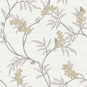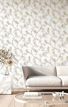 Luxuriöse cremefarbene Vliestapete mit Vinyloberfläche, weicher Stoffeffekt mit blühenden Zweigen in goldbeigen und grauen Farbtönen.