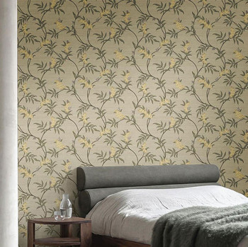 Luxuriöse beige Vliestapete mit Vinyloberfläche, weicher Stoffeffekt mit blühenden Zweigen in metallischen Gold- und Grüntönen.