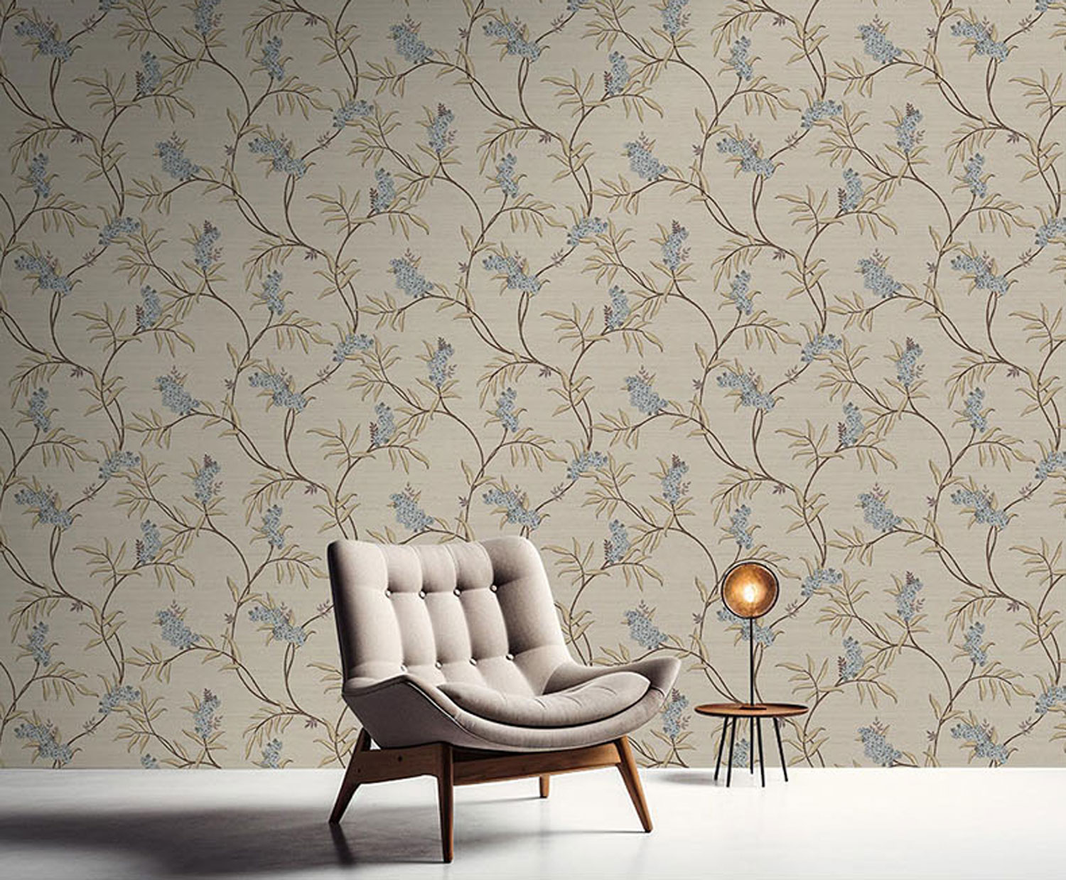 Luxuriöse sandfarbene Vliestapete mit Vinyloberfläche, weicher Stoffeffekt mit blühenden Zweigen in Metallic-Gold-, Braun- und Graublau-Tönen.
