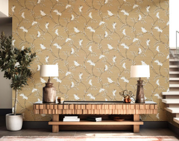 Luxuriöse braune Vliestapete mit Vinyloberfläche, weicher Stoffeffekt mit blühenden Zweigen in Braungold- und Weißtönen.