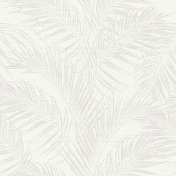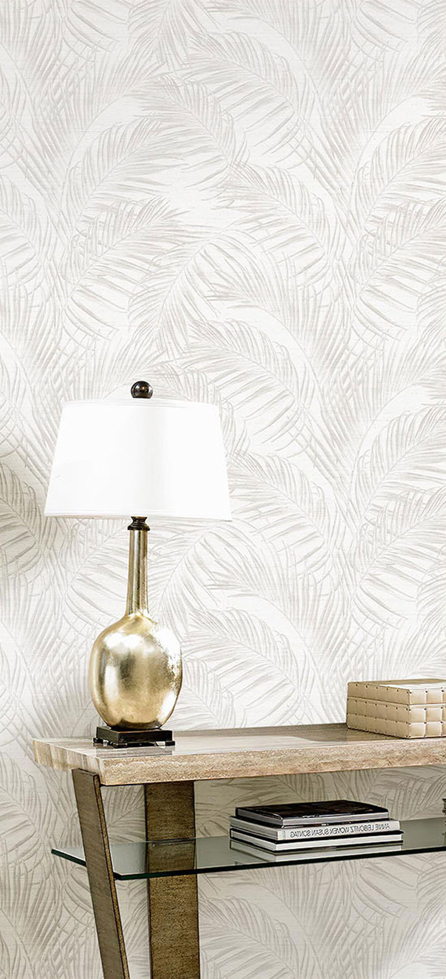 Luxuriöse Vliestapete mit Vinyloberfläche, geprägte Palmblattmotive, Cremetöne mit dezentem metallischem Goldglanz.
