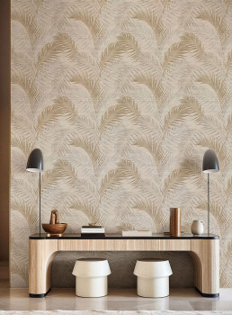 Luxuriöse halbglänzende cremefarbene / ecrufarbene Vliestapete mit Vinyloberfläche, geprägte Palmblattmotive, Braun-Gold- und Grautönen.