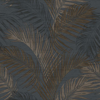 Luxuriöse metallisch blaue Vliestapete mit Vinyloberfläche, geprägte Palmblattmotive, Graublau-, Braun- und Goldtönen.