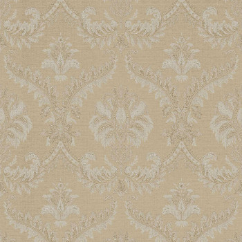 Luxuriöse beige Vliestapete mit Vinyloberfläche, zart geprägtes, gold-beiges, barockes Damastmuster.