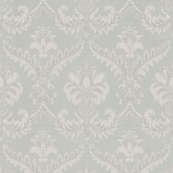 Luxuriöse graue Vliestapete mit Vinyloberfläche, zart geprägtes barockes Damastmuster in Gold-Beige-Tönen.