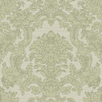 Luxuriöse grüne Vliestapete mit Vinyloberfläche, zart geprägtes barockes Damastmuster.