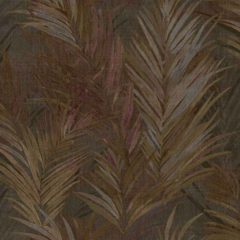 Luxuriöse geprägte braune Vliestapete mit Vinyloberfläche, Motive von Zweigen und Blättern in den Farbtönen Terrakotta, Burgund, Grau-Silber, Braun-Gold, gröbere Struktur.