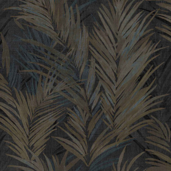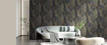 Luxuriöse geprägte schwarze Vliestapete mit Vinyloberfläche, Motive von Zweigen und Blättern in Grautönen, seidenmattem Gold und Bronze;, gröbere Struktur.