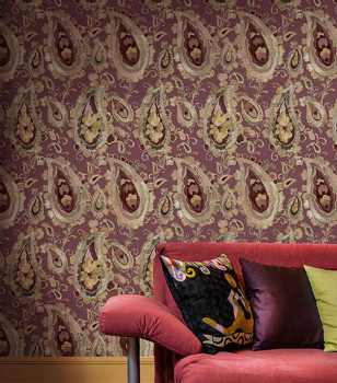 Vliestapete mit Vinyloberfläche, bordeauxroter Hintergrund, ornamentale Muster in Grau-Beige- und Ocker-Gold-Tönen, Stoffstruktur.