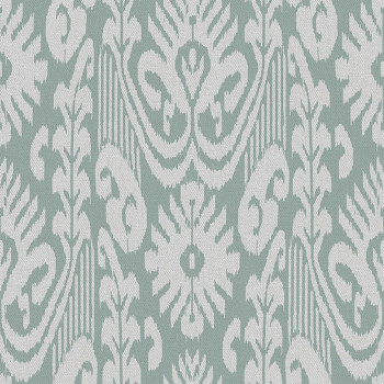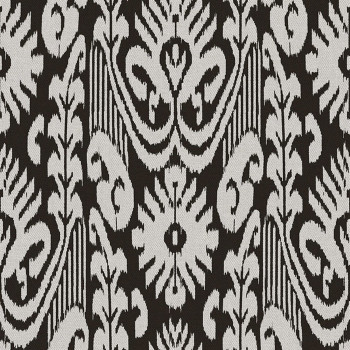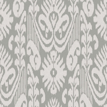 Vliestapete mit Vinyloberfläche, an Wandteppiche erinnernde Muster, Grau- und Schwarztöne, Stoffstruktur.