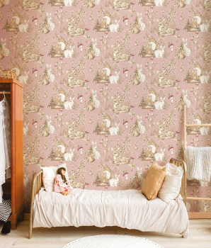 Grau-beige Vliestapete, Motive von Waldtieren und Pflanzen.