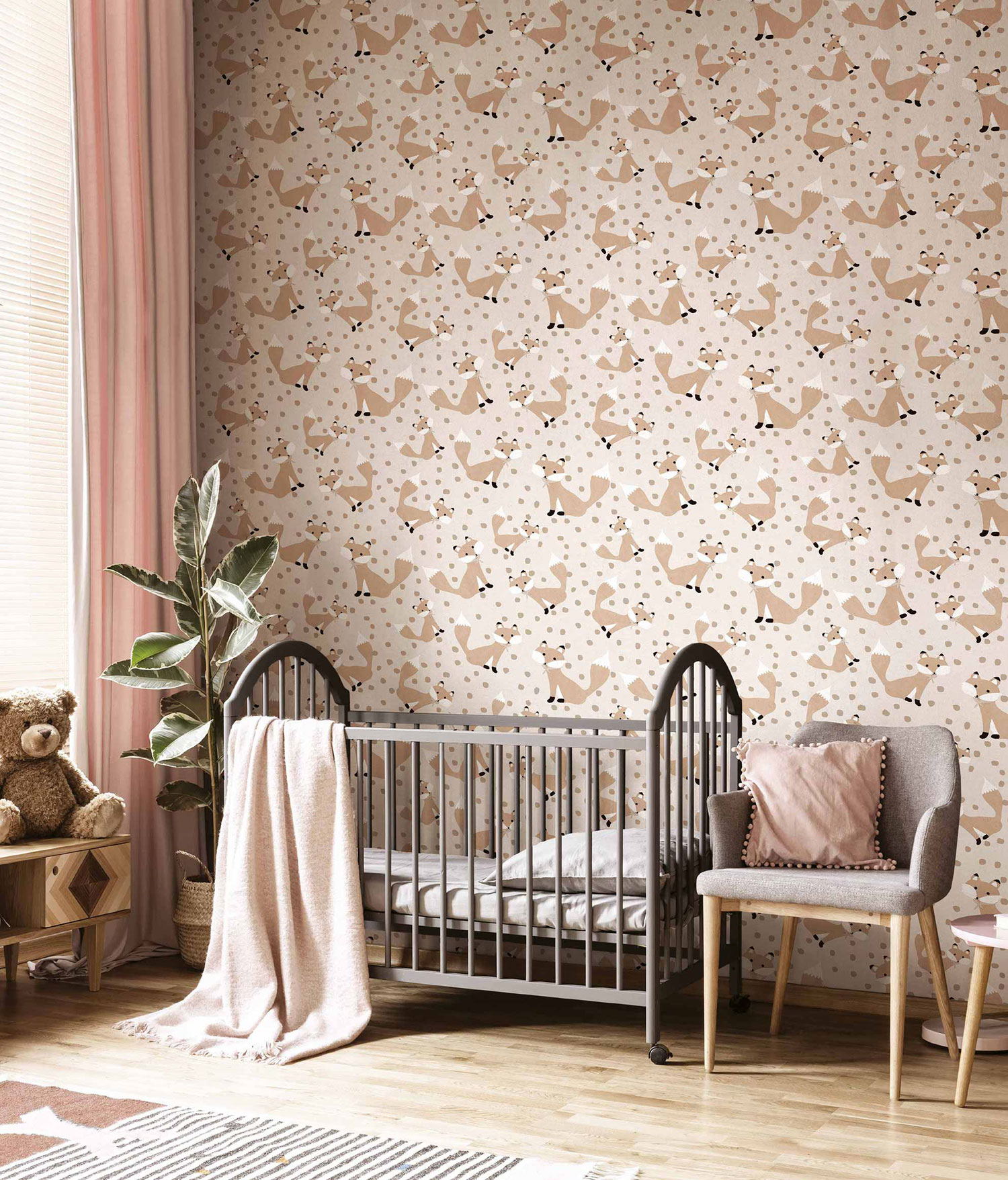 Beige Vliestapete, Motive von Füchsen und unregelmäßigen Punkten.