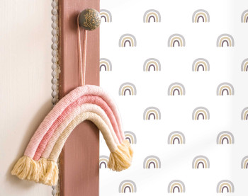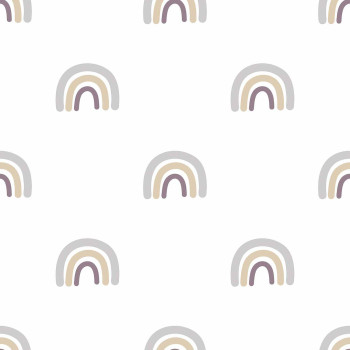 Weiße Vliestapete, Regenbogen in Grautönen, Dunkellila und Goldbeige.