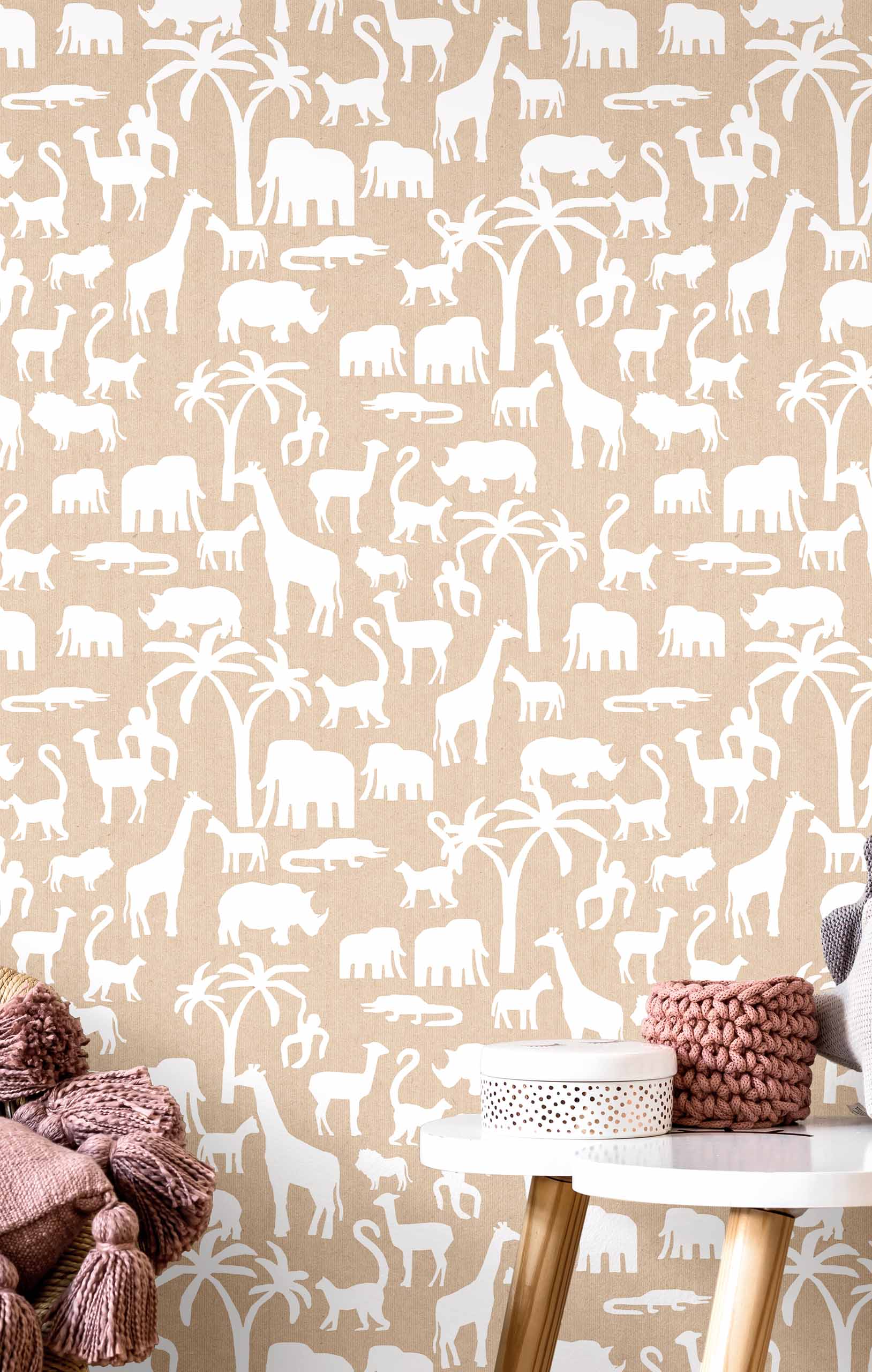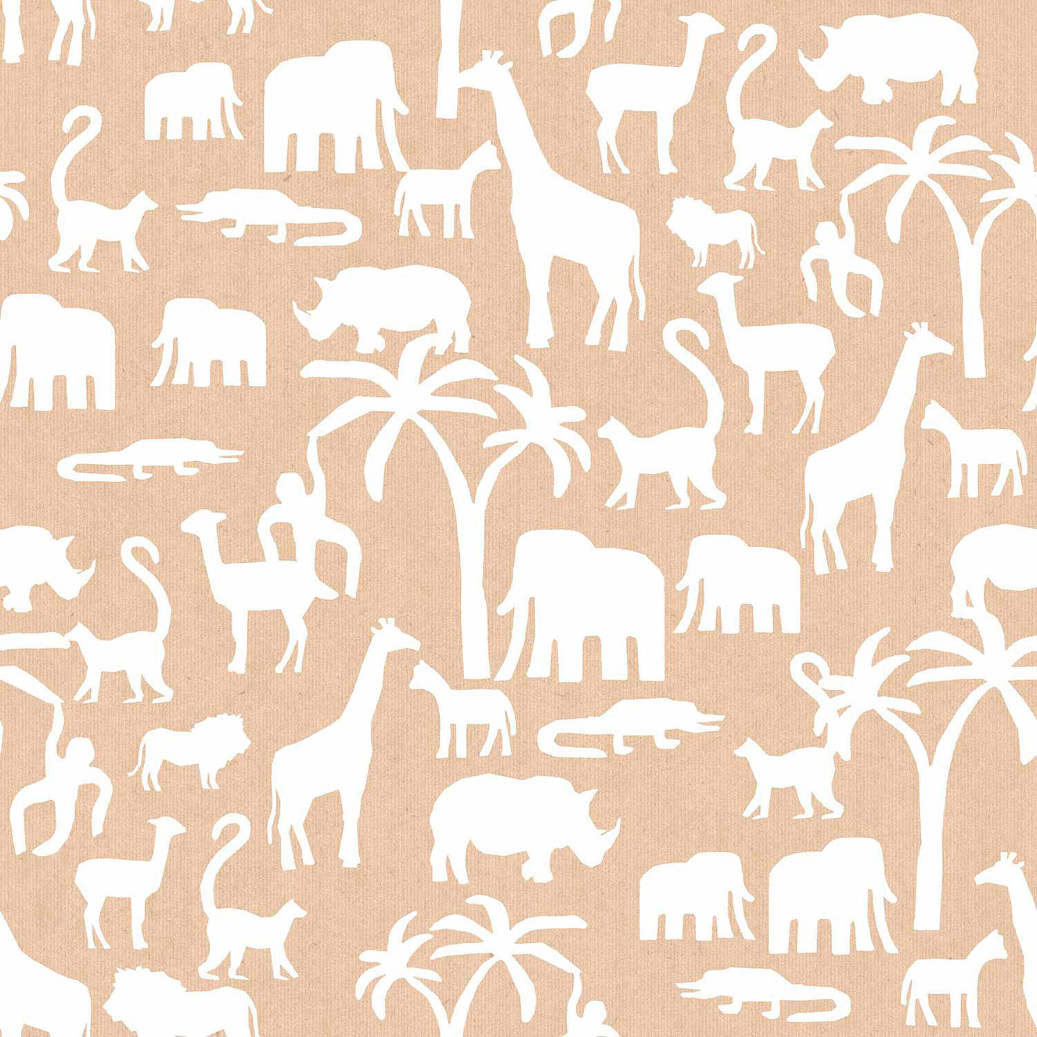Braune Vliestapete, weiße Silhouetten von Tieren aus Afrika und Palmen.