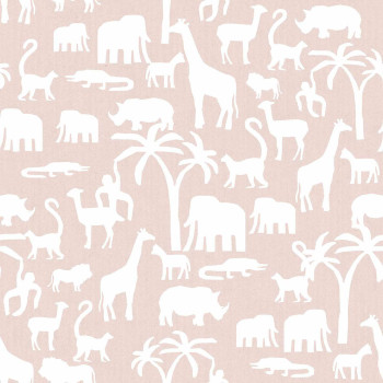 Rosa Vliestapete, weiße Silhouetten von Tieren aus Afrika und Palmen.