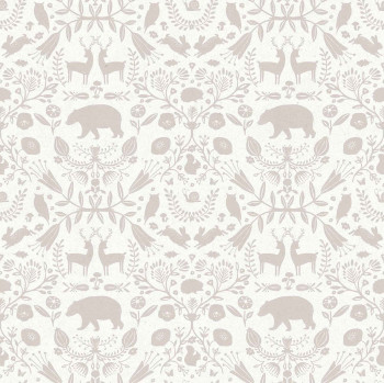 Grauweiße Vliestapete, Motive von Tieren und Blumen.