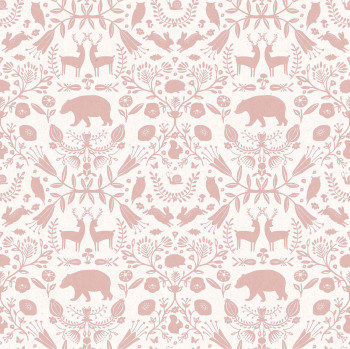 Rosa-weiße Vliestapete, Tier- und Blumenmotive.