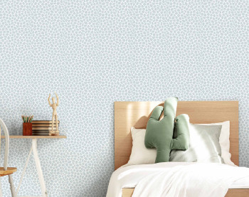 Blaue Vliestapete mit einem Muster, das an das Fell einer Giraffe erinnert.