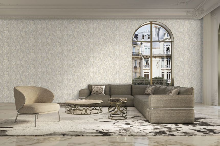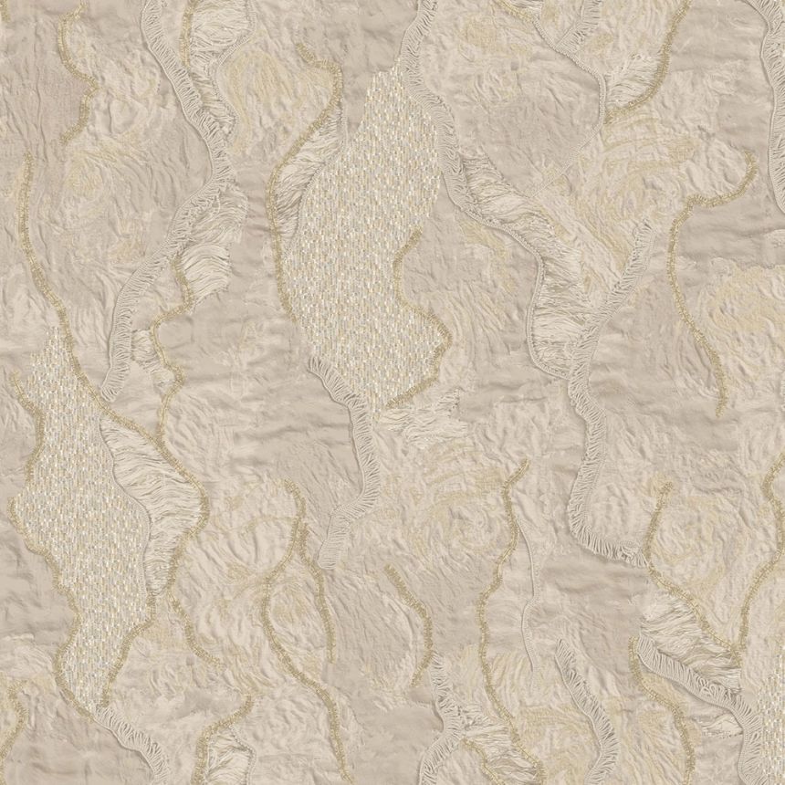 Luxuriöse beige Vliestapete mit Vinyloberfläche; geprägtes, halbglänzendes Muster mit winzigen Goldglitzern.