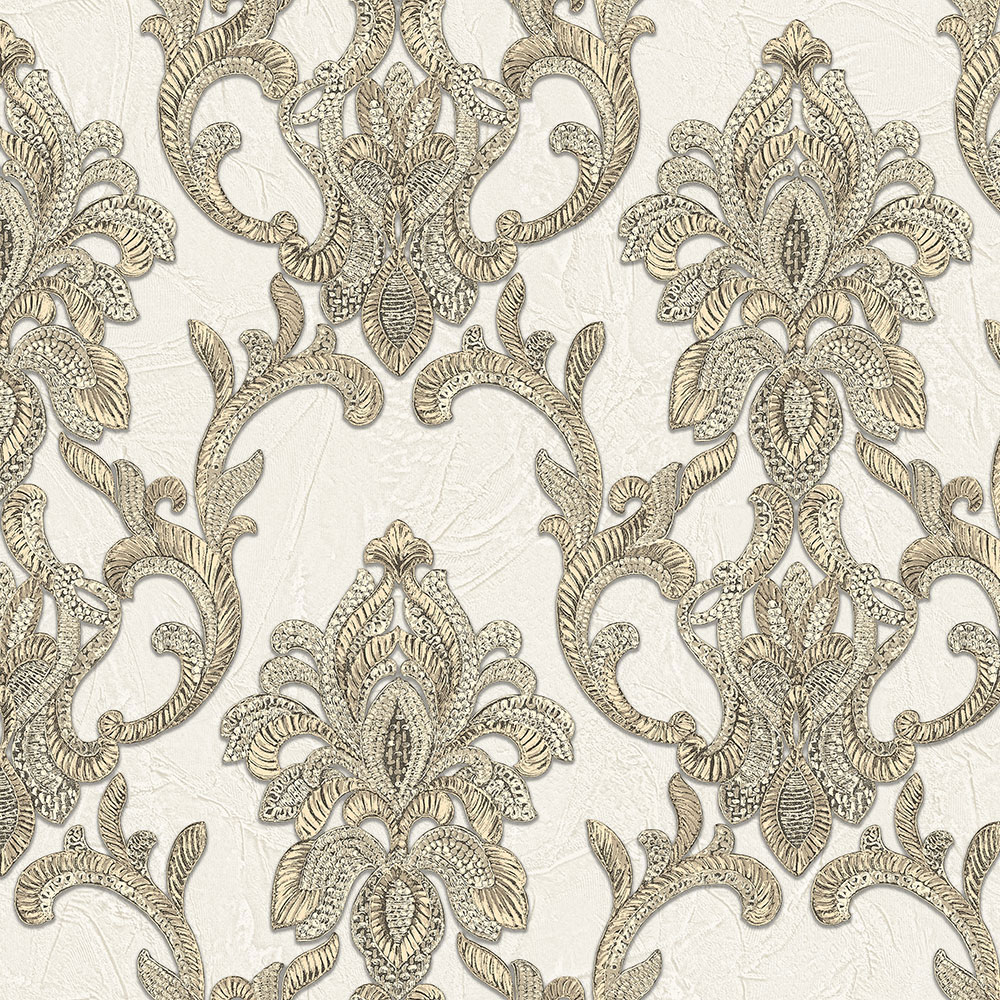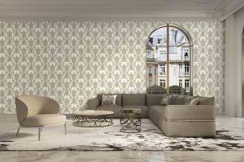 Luxuriöse cremefarbene Vliestapete mit Vinyloberfläche, gold-silbernes Barockmuster.