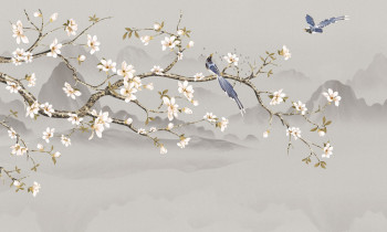 Luxuriöse Vliestapete Wandbilder, Landschaftsmotiv mit blühendem Sakura-Zweig und Vögeln.