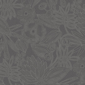 Zart geprägte, grau-schwarze Vliestapete, Spitzenmuster.