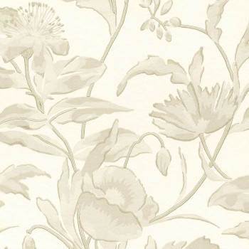 Glatte cremeweiße Vliestapete; goldbeiges Blumenmuster.