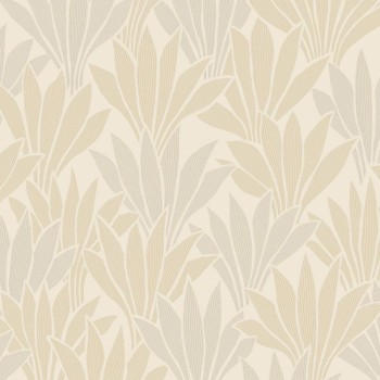 Fein strukturierte Vliestapete, Creme- und Beigetöne, Gold- und Perlmuttlinien auf den Blättern.