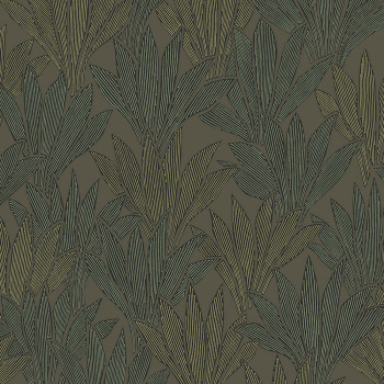 Fein strukturierte Vliestapete, Grau- und Grüntöne, metallische Linien auf den Blättern.