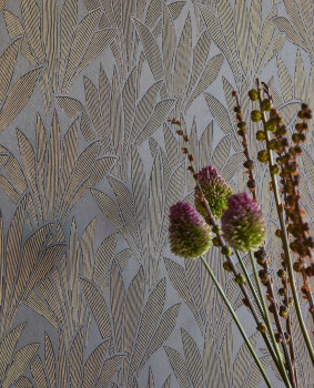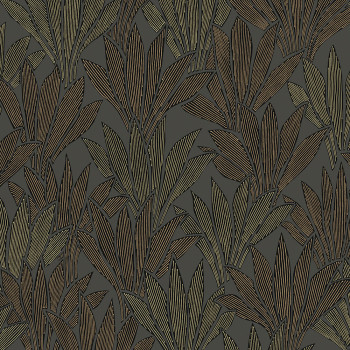 Fein strukturierte Vliestapete, Grau- und Schwarztöne, Gold- und Bronzelinien auf den Blättern.