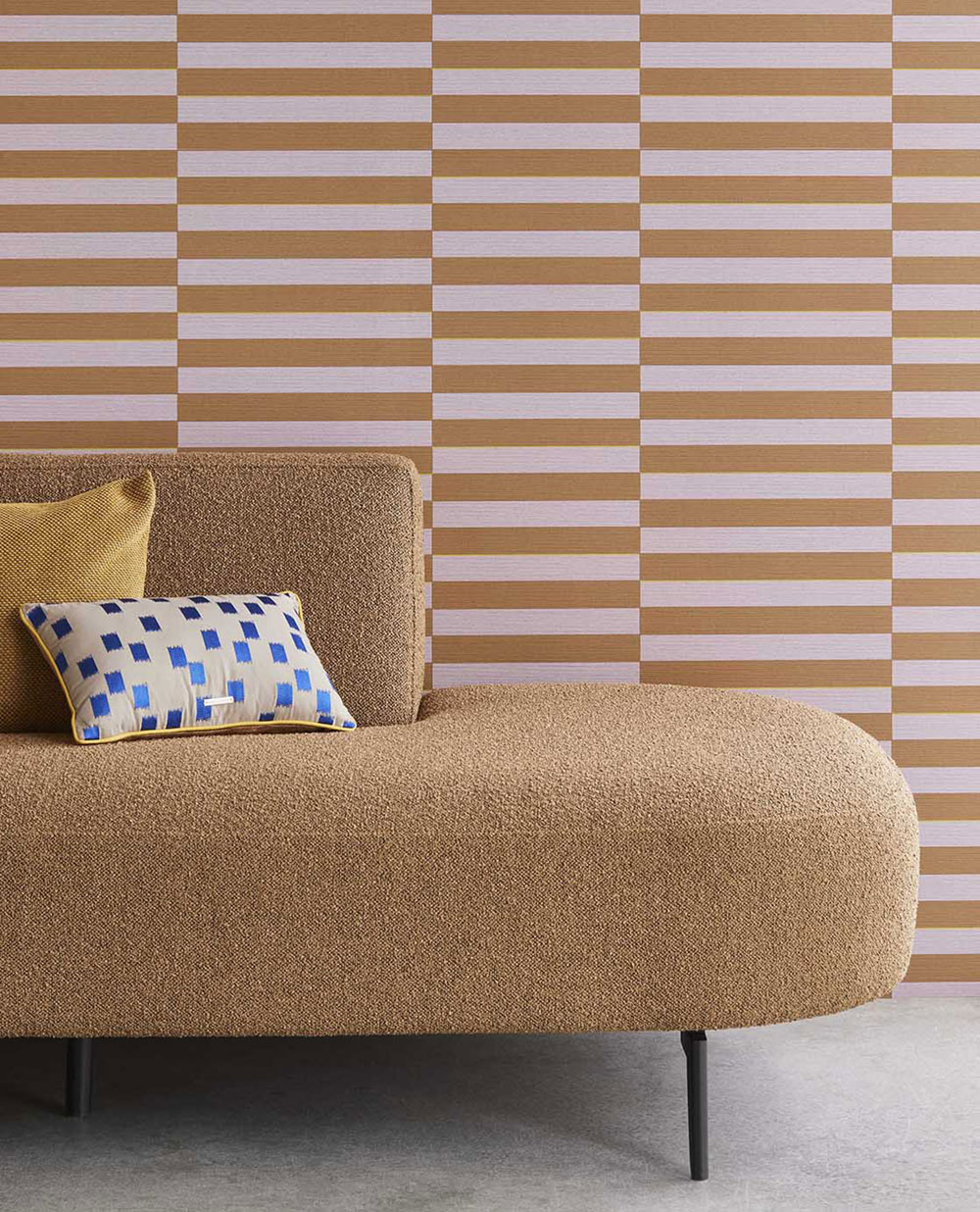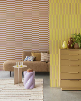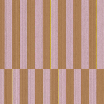 Zart geprägte gestreifte Vliestapete im Retrostil, Braun- und Lilatöne, stellenweise gelbe Linien.