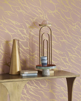 Rosa Vliestapete mit zart geprägtem goldenem Muster.