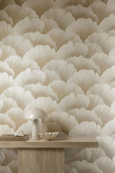Geprägte Vliestapete, Ginkgoblätter in Grau-Beige-Tönen.