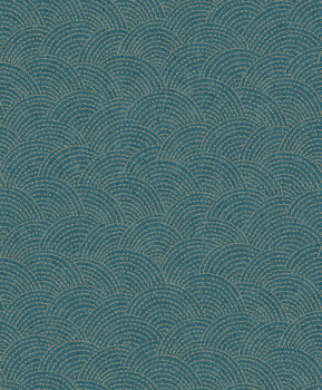 Blaue Vliestapete, goldenes geometrisches Bogenmuster.