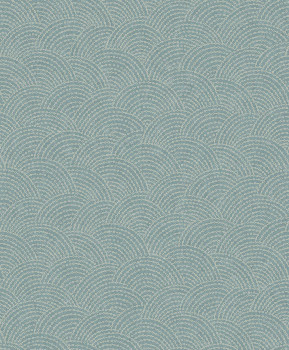 Blaue Vliestapete, zart geprägtes weißes geometrisches Bogenmuster.