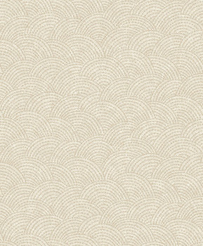 Beige Vliestapete, zart geprägtes geometrisches Bogenmuster.