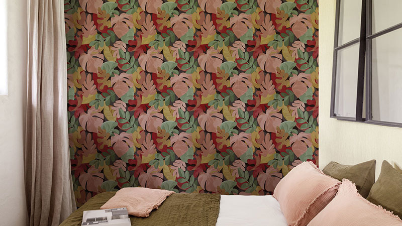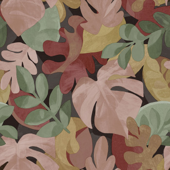 Vliestapete, Blättermotive, Rosa-, Burgunder-, Grün- und Ockertöne auf grauschwarzem Hintergrund.