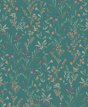 Vliestapete, Wiesenblumenmuster, Grün-, Braun-, Lila- und Ziegeltöne, türkisfarbener Hintergrund.