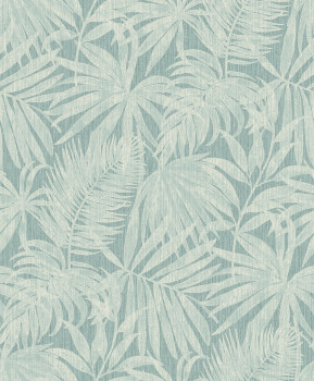 Vliestapete, Blättermotive, Blau-/Türkistöne, melierte Struktur.