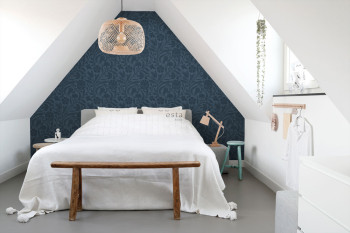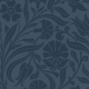 Glatte, dunkelblaue Vliestapete mit floralem Muster.