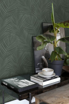 Glatte grüne Vliestapete mit Palmblättern.