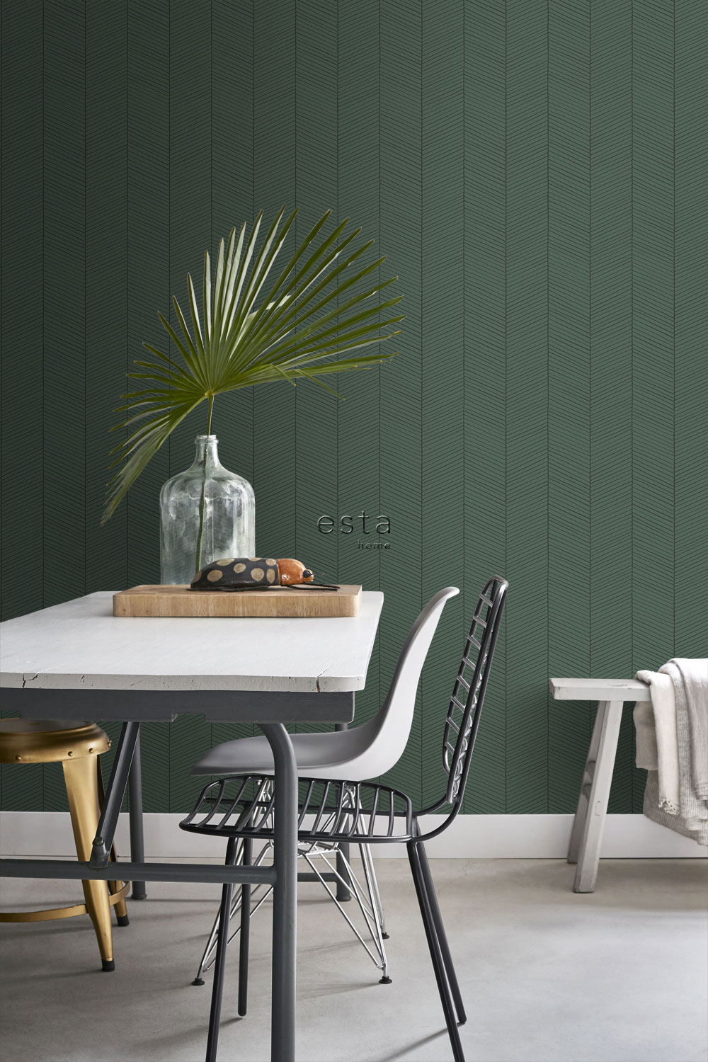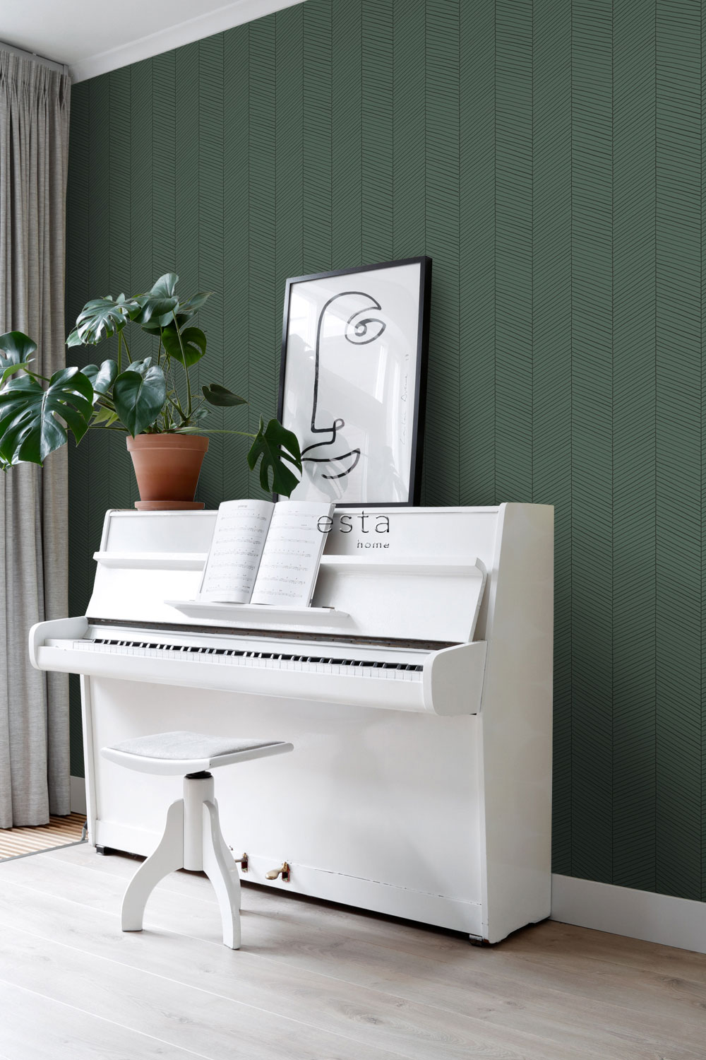 Glatte grüne Vliestapete mit geometrischem Muster.