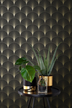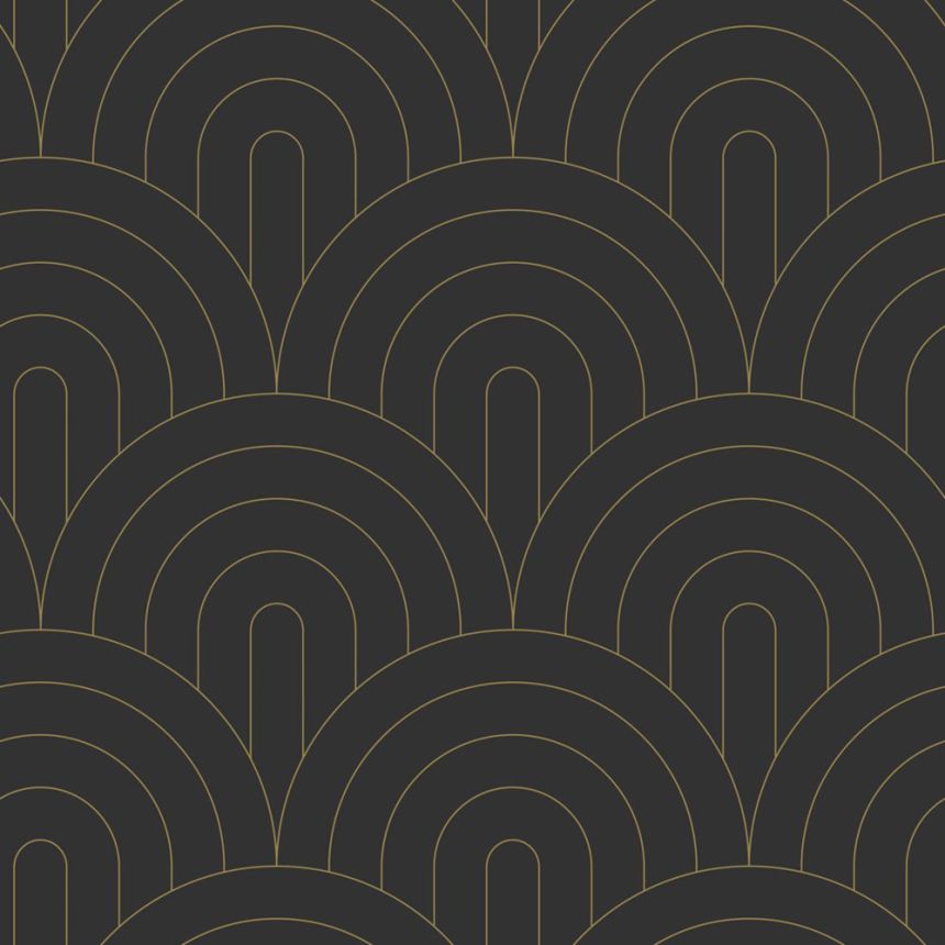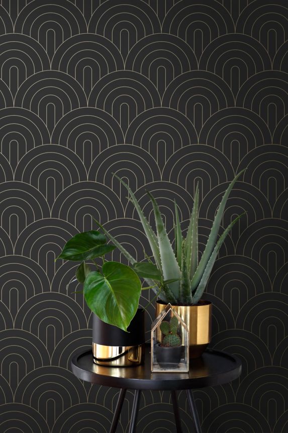 Glatte schwarze Vliestapete, goldene Konturen.