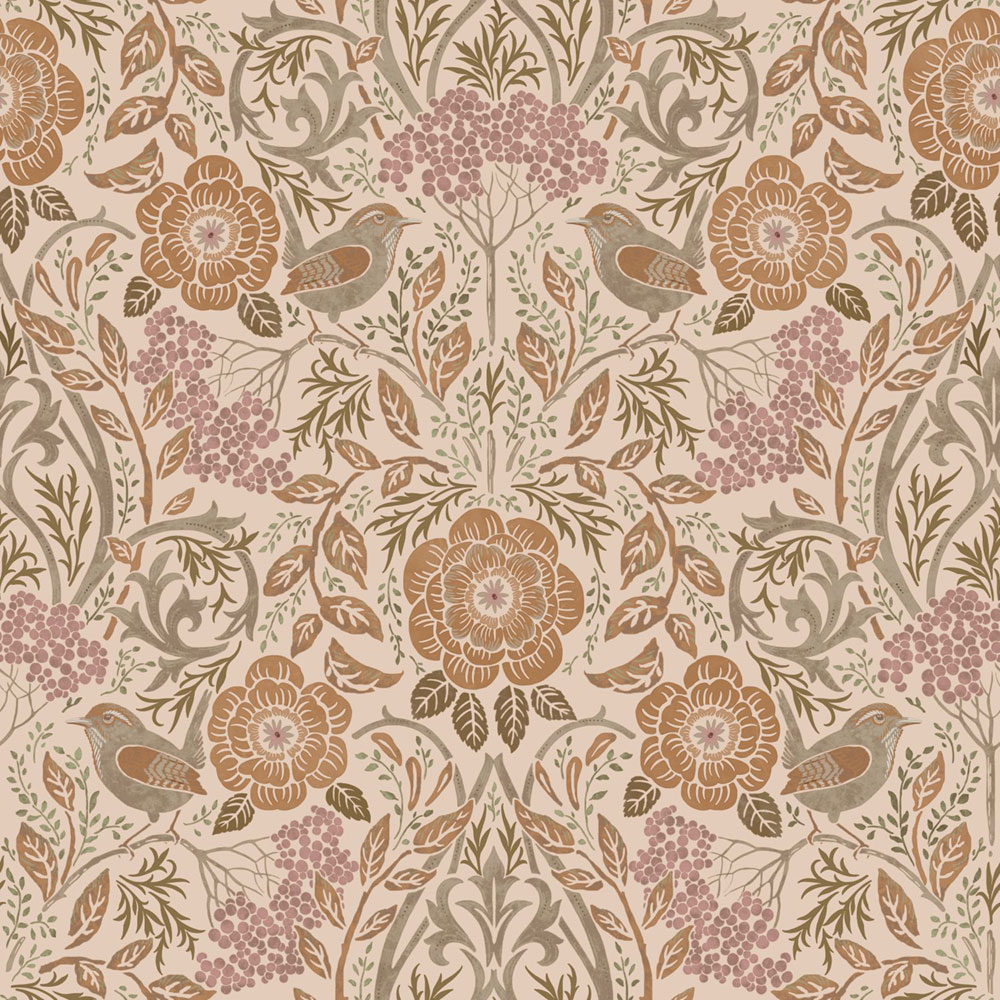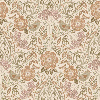 Glatte hellbeige Vliestapete, sattes Muster mit Blumen und Vögeln in Grün-, Braun- und Lavendeltönen.