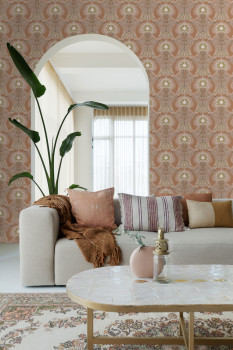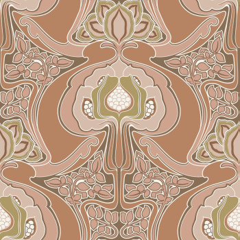 Vliestapete mit Jugendstil-Blumenmuster in Rosa-, Beige- und Brauntönen.