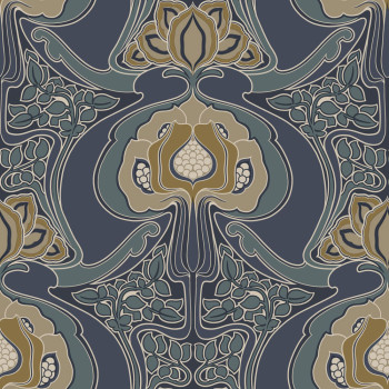 Vliestapete mit Jugendstil-Blumenmuster in Blau- und Braun-Beigetönen.