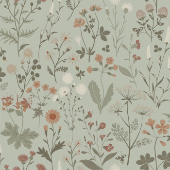 Grüne glatte Vliestapete, Muster aus Wiesenblumen in Grün-, Braun- und Ziegeltönen.
