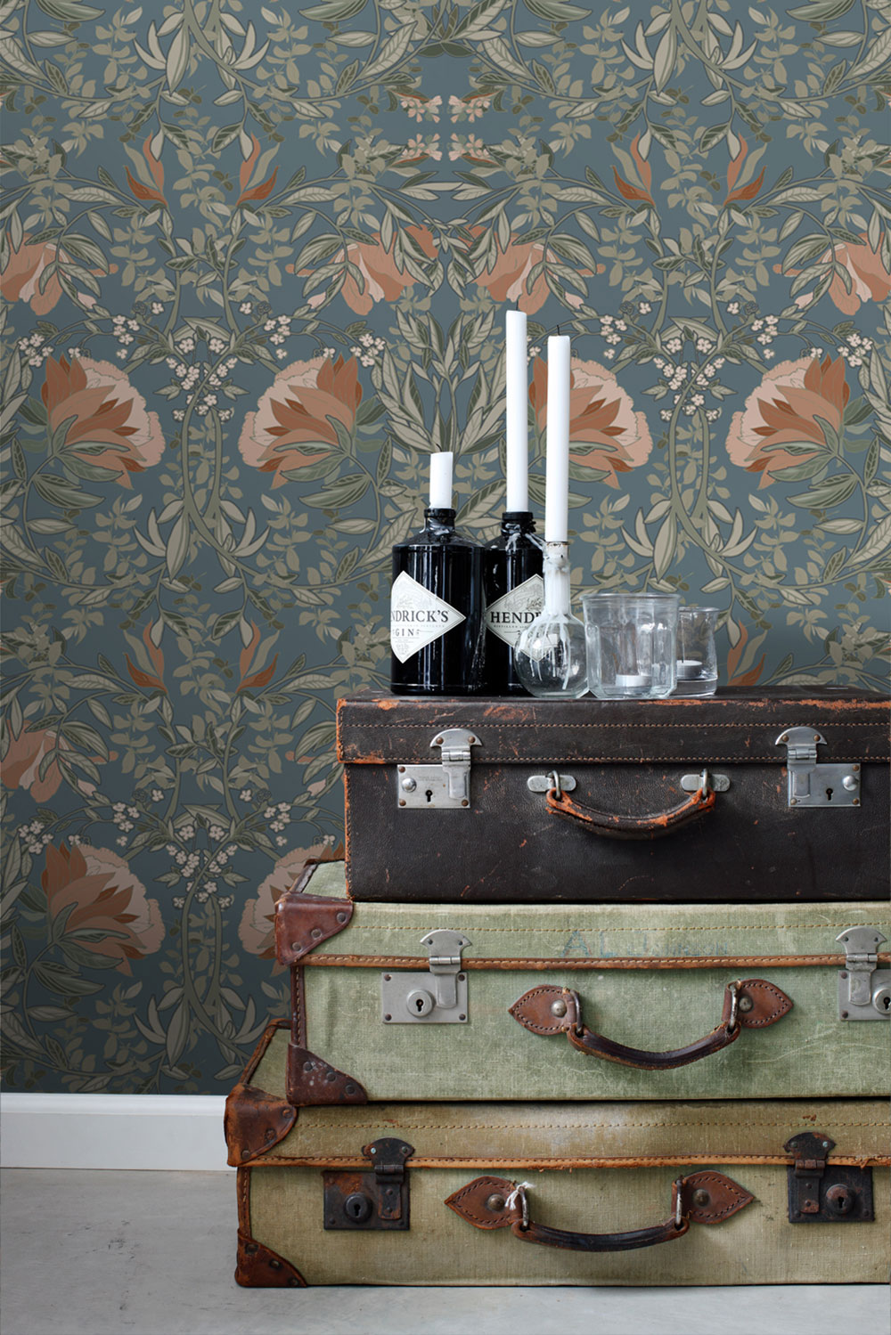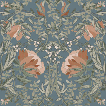 Blaue Vliestapete mit Jugendstil-Blumenmuster in Grün-, Ziegel- und Hellrosatönen.